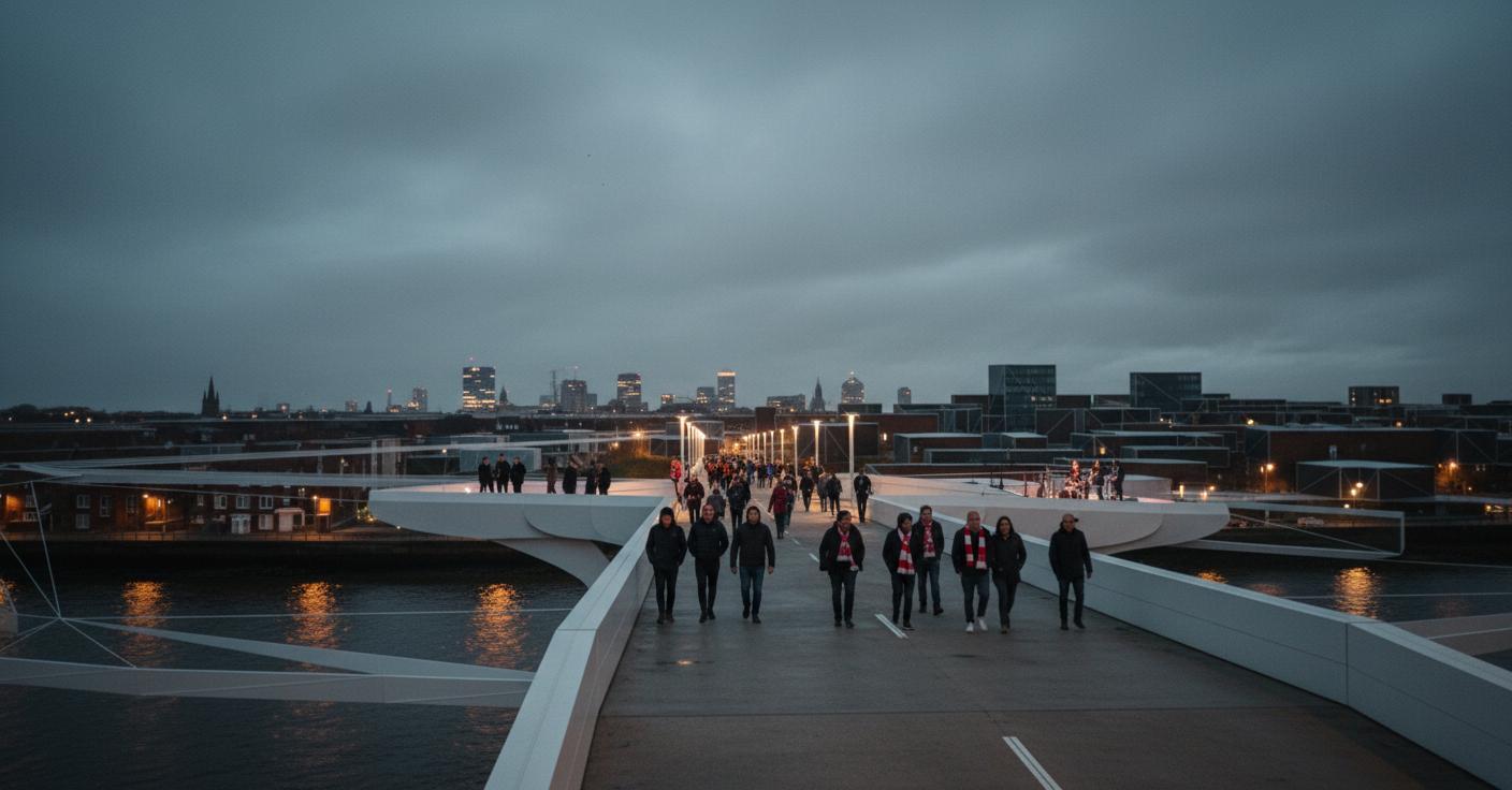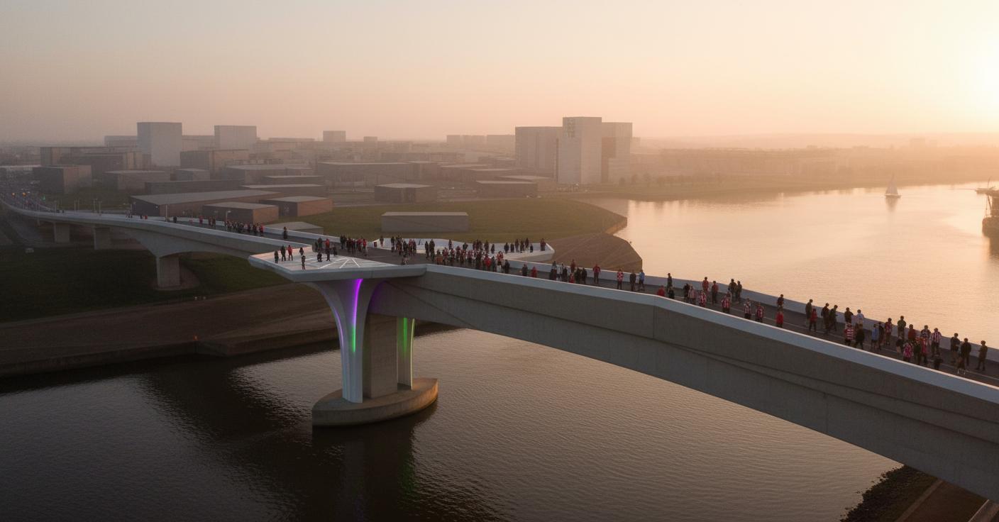 The Sky Deck is intended to provide a flexible public space that encourages people to pause and enjoy the elevated position offered by existing bridge structures, without requiring people to block existing, often limited pavement space. Illustrated below, the Sky Deck provides a place for football fans to gather on match day and celebrate their team's success.