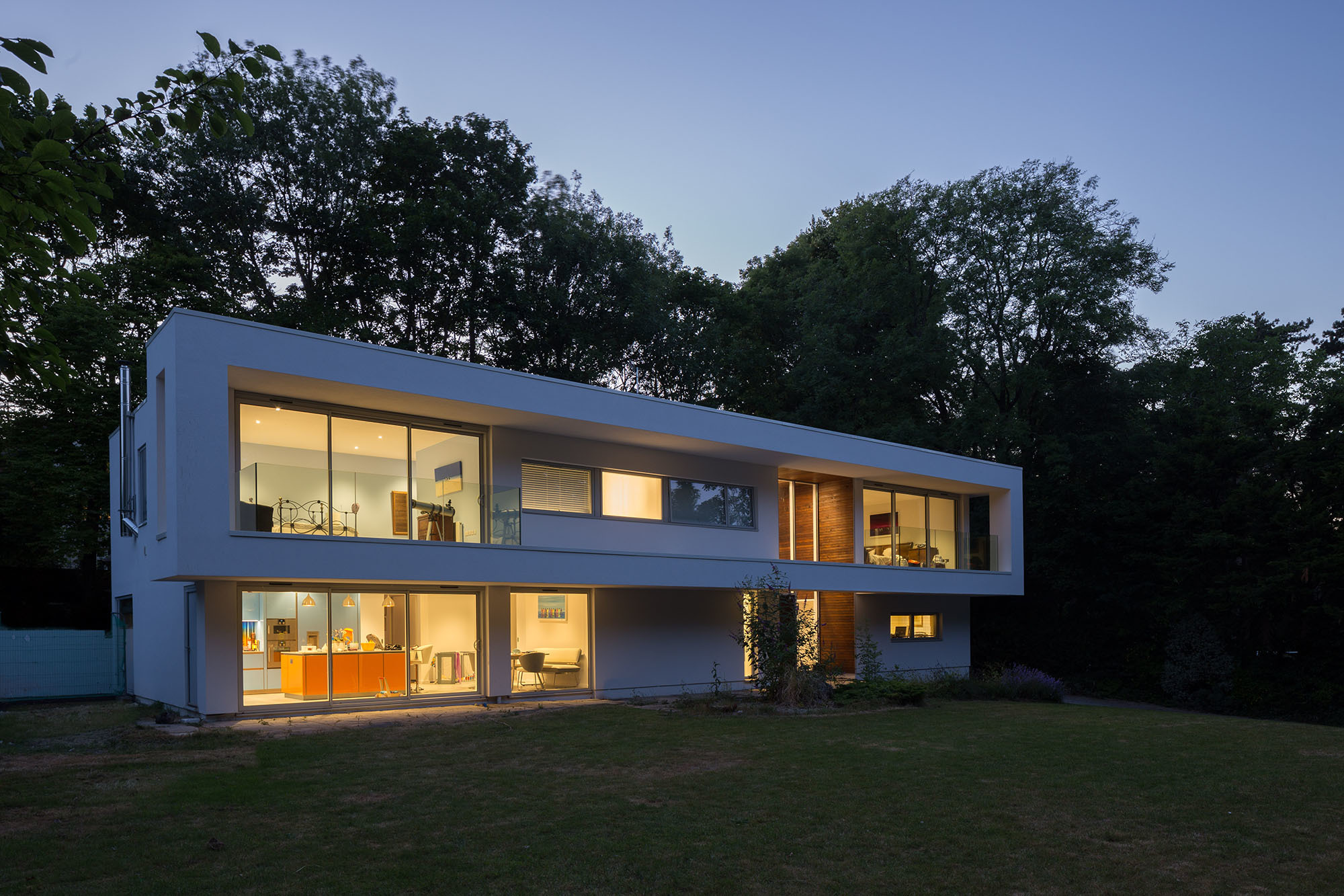 The exterior is a crisp white render with a colour, texture and inhabitation enclosed with a wrapping picture frame. At night the house is transformed into a picture of colour and light with the warmth of the interior spilling out.