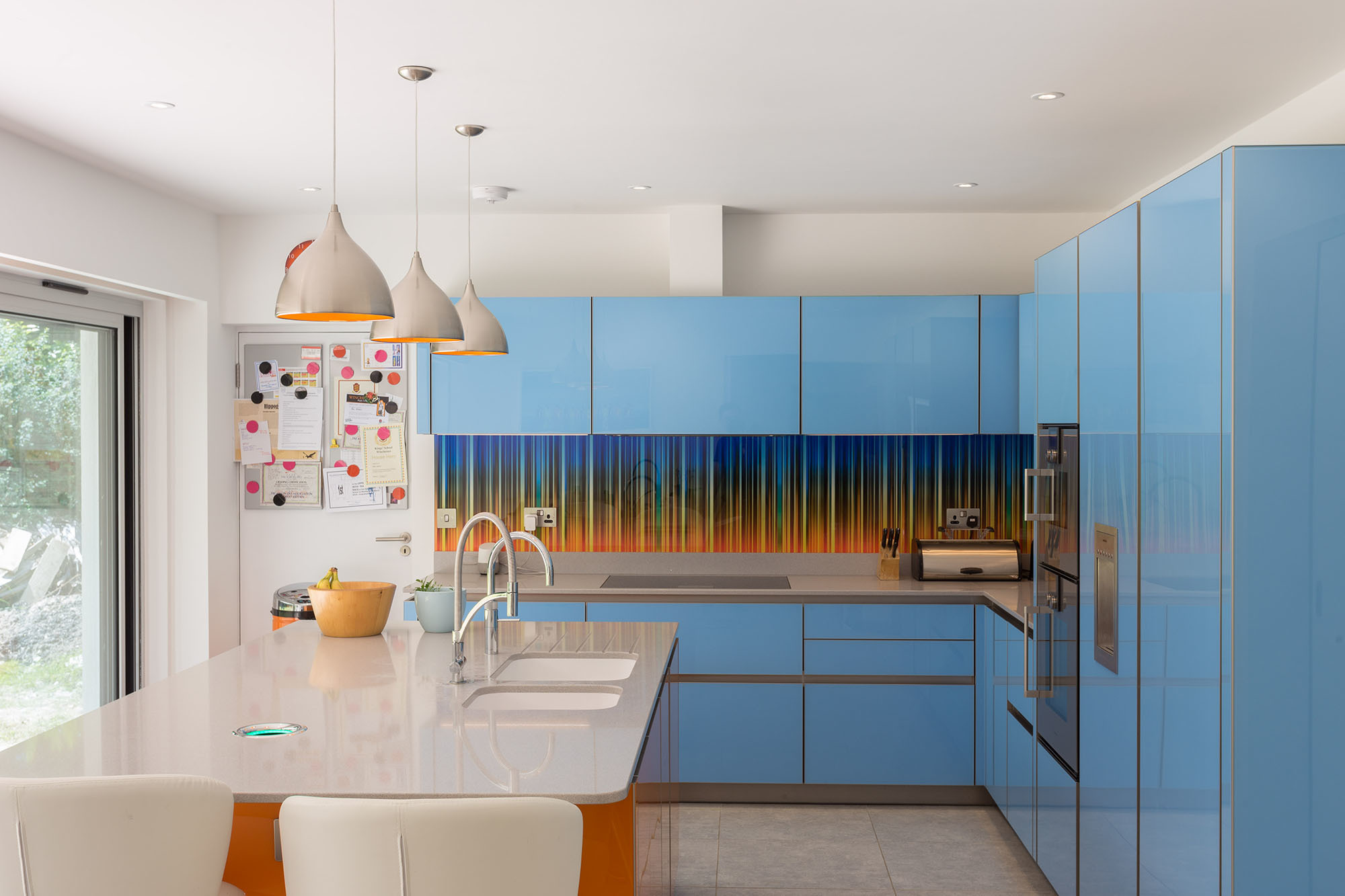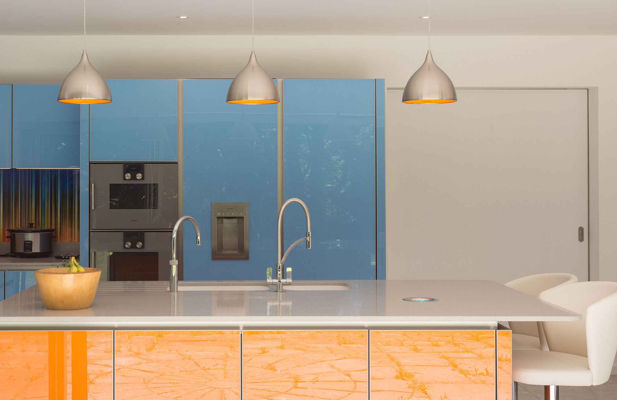 The interior is colourful and contemporary with a mixture of vibrant high gloss colours and natural timber defining volumes and breaking up the prevailing white aesthetic.