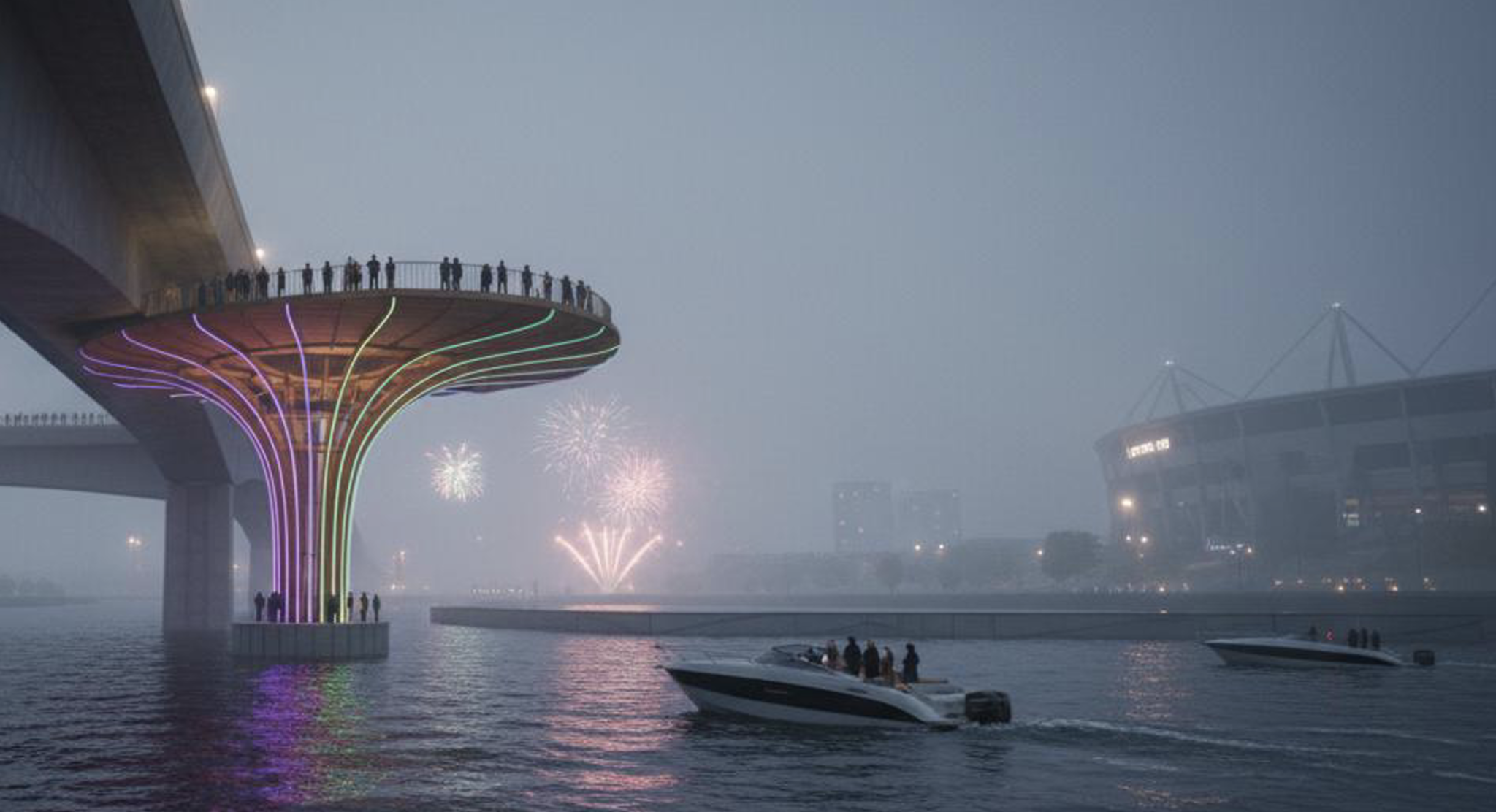 People stand on the Sky Deck watching a celebratory fireworks display, marking the opening of a new stadium.